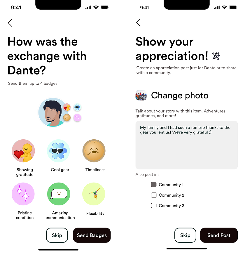 This led to the creation of a badge system: a friendly alternative to a traditional rating system that avoids hierarchy while recognizing good borrowing behavior. It also served as the first micro-interaction that made sharing fun.